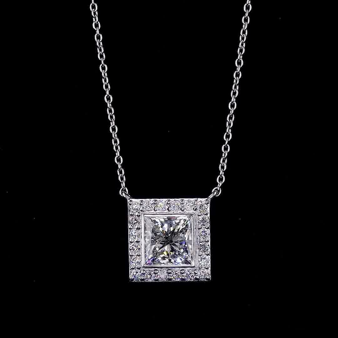 Princess Cut Diamond Square Halo Pendant – White Gold