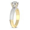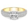 This elegant ring features radiant side stone lab-grown diamonds in double frame. The band is accentuated by prong set side diamonds on either side, adding a touch of sophistication and enhancing the overall brilliance of the ring. Available in 14K or 18K yellow, white, or rose gold, or 925 sterling silver.