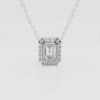 This Emerald-Cut Halo Diamond Pendant is a timeless expression of sophistication and elegance. Featuring a stunning emerald-cut diamond at the center, the pendant is framed by a radiant halo of round diamonds, enhancing the center stone's brilliance and creating a captivating sparkle. Set in polished white gold, this pendant adds a touch of glamor to any outfit and is perfect for both everyday elegance and special occasions.